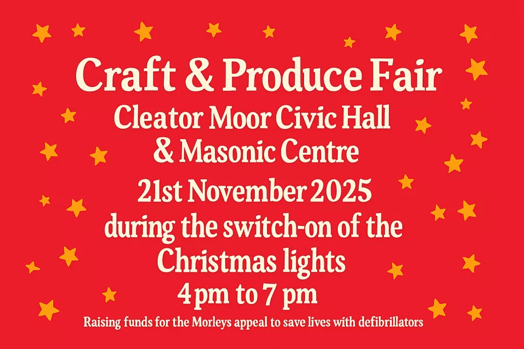 On Friday 21St November 2025 the Christmas lights will be switched on in Cleator Moor. At the same time we will be holding a Craft and Produce fair in the Civic Hall and Masonic Center in the heart of Cleator Moor.
