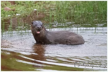 8am in the pouring rain and I spotted something unusual in the water of the pond, it was an Otter ! So I quickly put my rain clothes on and headed out in the pouring rain. The large dog Otter was busy fishing, took one look at me and decided I was no threat so carried on, I sat down and watched.