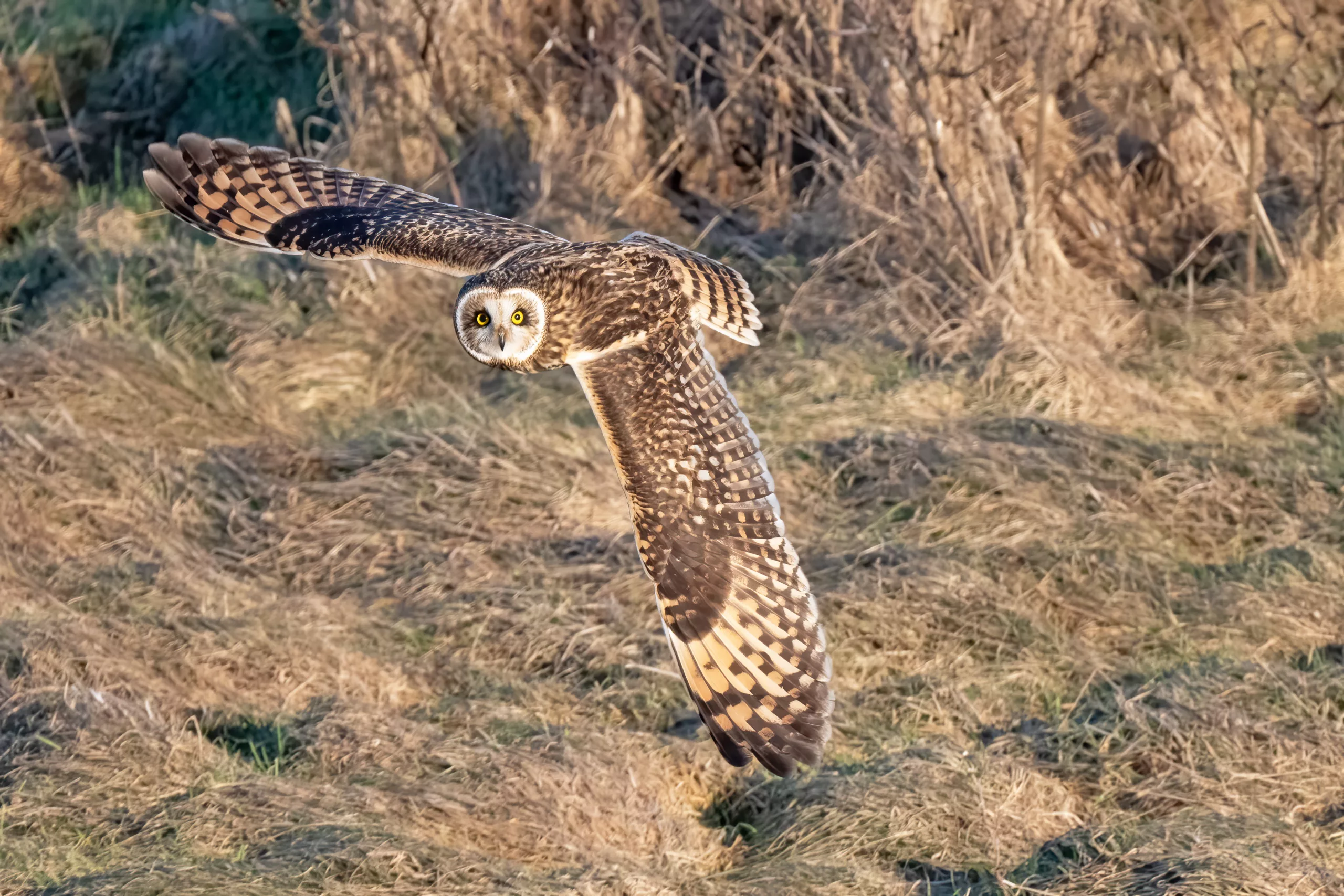 Short Eared Owl flying by in the afternoon sun in West Cumbria