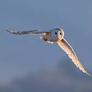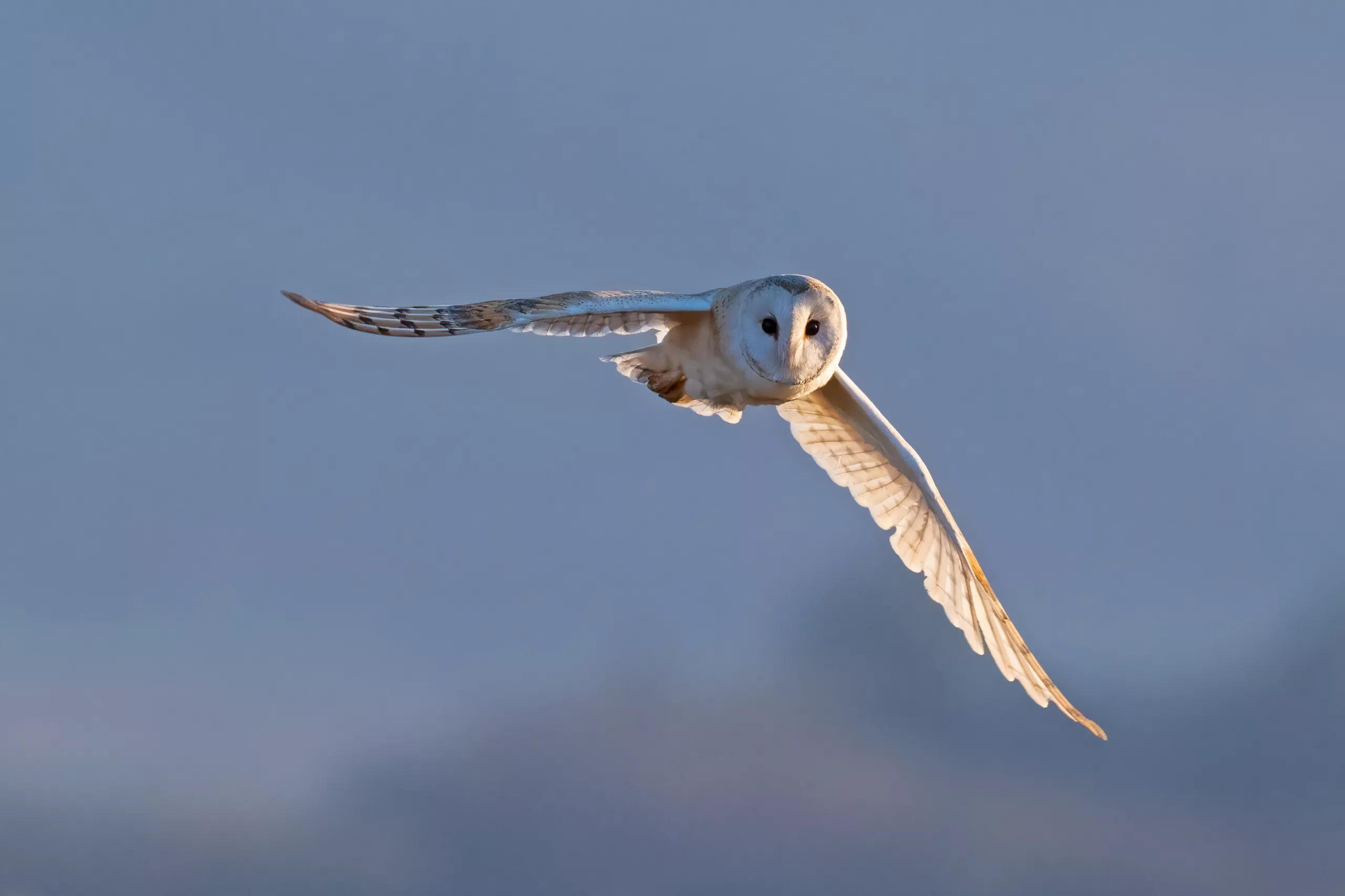 Barn Owl in flight in the Cumbrian Sunset and blue sky, this Owl creeped up behind me and I only had time to grab two quick shots before it was over my head and away